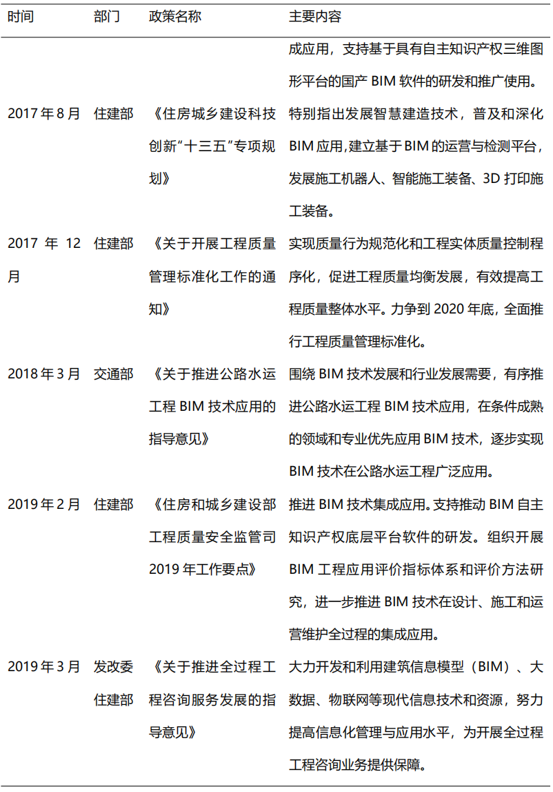 隨著社會的發(fā)展,行業(yè)需求的轉變,加之國家和各地政府的扶持,建筑行業(yè)信息化、數據化、智能化趨勢不可逆轉。BIM勢必全面應用到規(guī)劃、勘察、設計、施工和運營維護中來,實現(xiàn)工程建設項目全生命周期數據共享和信息化管理。近年來,國務院、住建部等相關單位,頻繁頒發(fā)鼓勵和要求應用BIM技術的指導意見,表1列出了國家層面的重要文件。