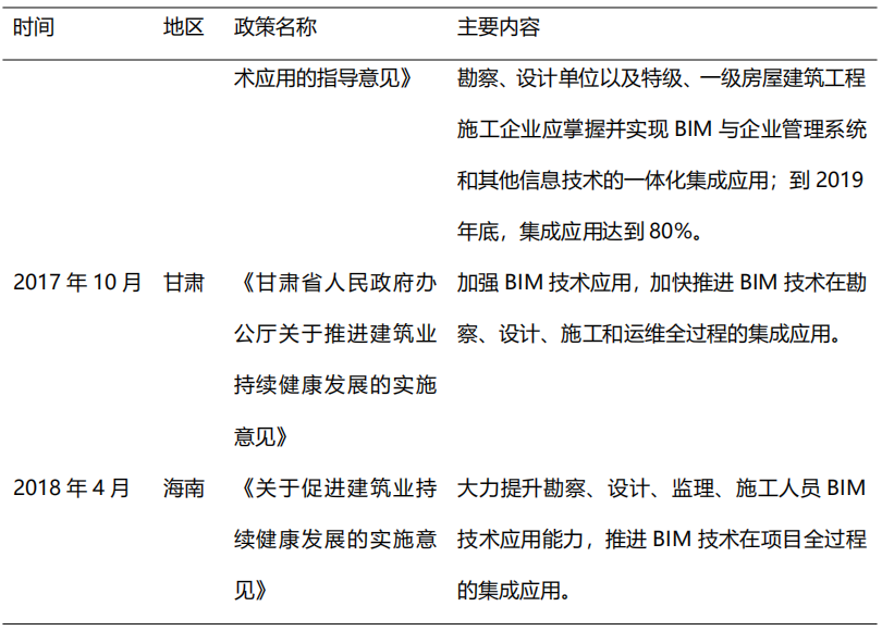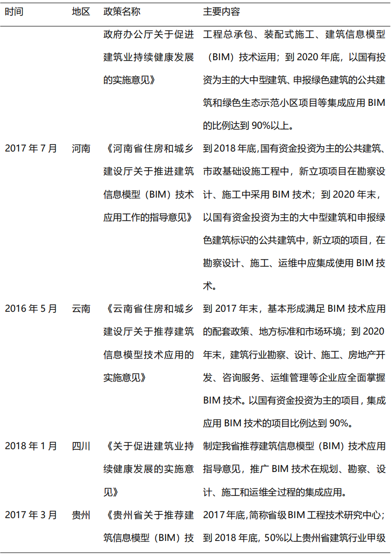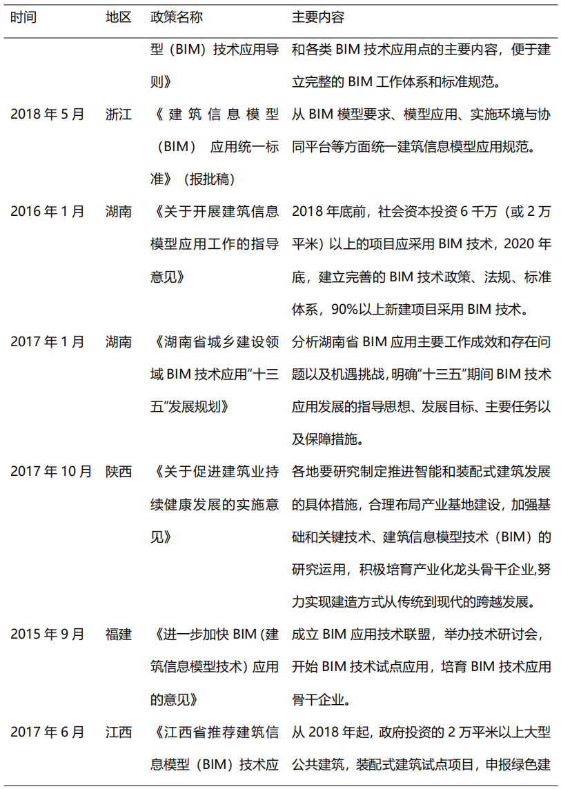 從2014年開始,在住建部的大力推動下,各省市政策相繼出臺BIM推廣應用文件,到目前我國已初步形成BIM技術應用標準和政策體系,為BIM的快速發(fā)展奠定了堅實的基礎。2017年,貴州、江西、河南等省市正式出臺BIM推廣意見,明確提出在省級范圍內提出推廣BIM技術應用。2018-2019年,各地政府對于BIM技術的重視程度不減,重慶、北京、吉林、深圳等多地政策出臺指導意見,旨在推動BIM技術進一步應用普及。隨著我國出臺BIM推廣意見的省市數量逐漸增多,全國BIM技術應用推廣的范圍更加廣泛。表2列舉了部分重要地方鼓勵政策。
