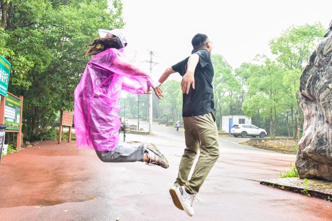 漸漸天空下起了小雨,我們也換上了五顏六色的雨衣。