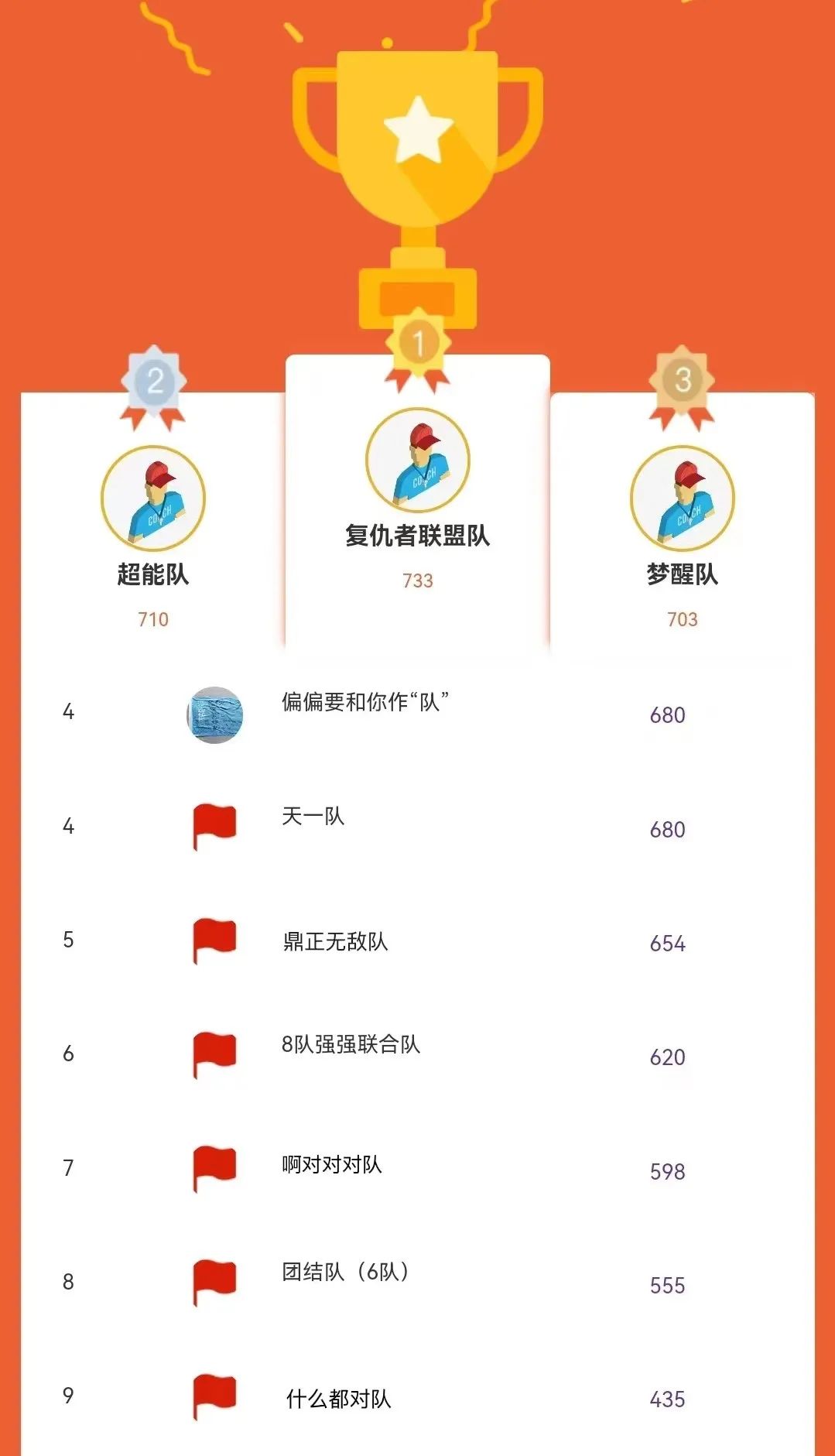 大家好,我們是“偏偏要和你作‘隊’”、“強強聯合隊”、“復仇者聯盟隊”、“鼎正無敵隊”、“啊對對對隊”、“超能隊”、“天一隊”、“團結隊”、“夢醒隊”、“什么都對隊”。