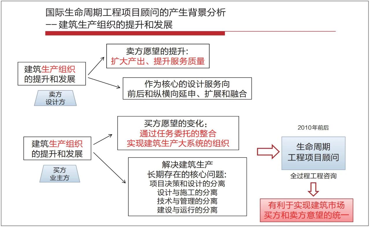 接下來,我們將從建筑生產組織的提升和發展來討論生命周期工程項目顧問是怎么產生的?也就是我們現在講的全過程工程咨詢是怎么產生的?它的初心是什么?我認為,它產生的背景主要是兩個:一個是賣方——設計方,另一個是買方——業主方。