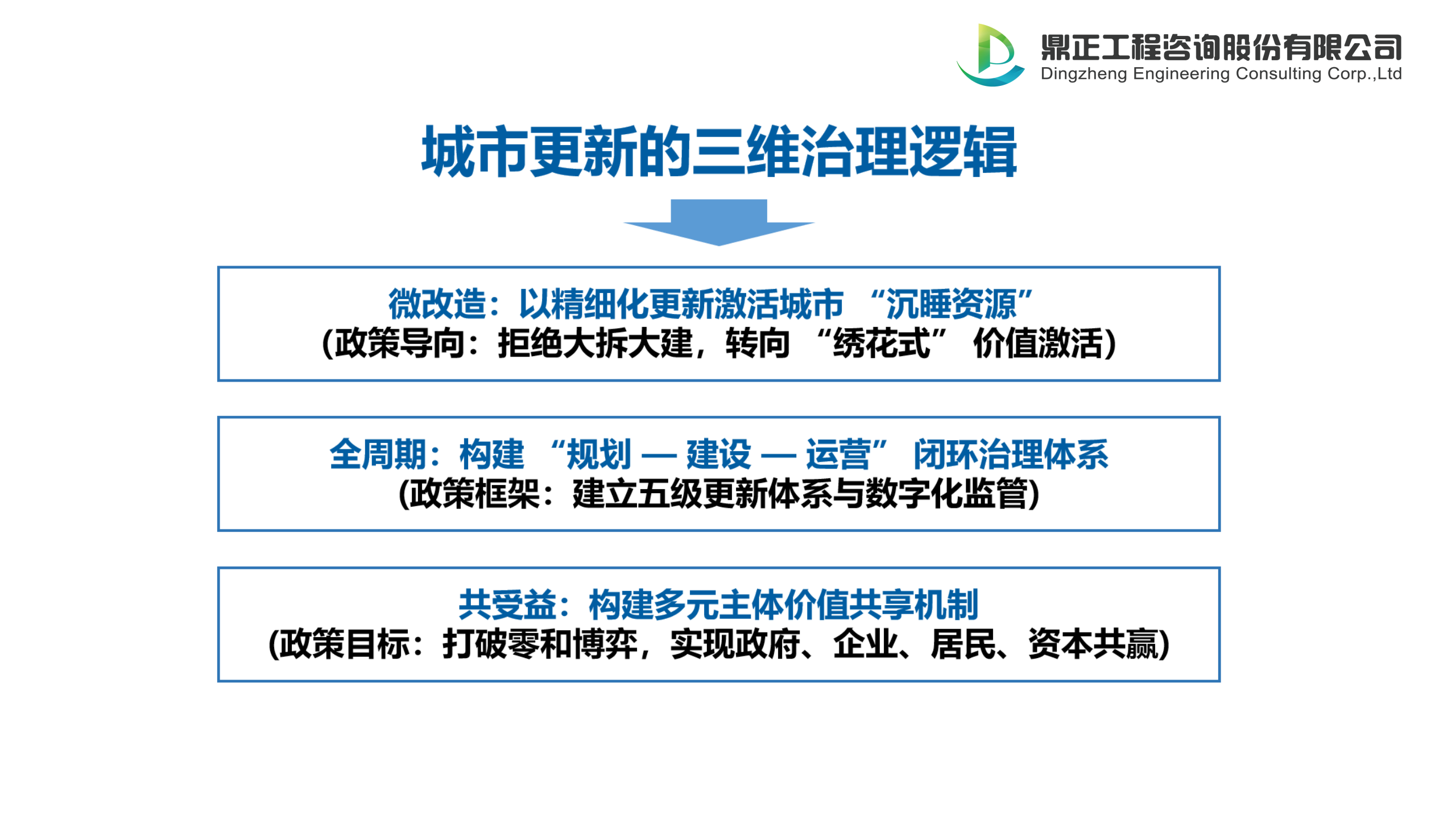 (二)全周期:閉環(huán)治理體系 《意見》提出構(gòu)建“房子—小區(qū)—社區(qū)—城區(qū)—城市”全鏈條更新體系,并通過(guò)“城市體檢—規(guī)劃引領(lǐng)—?jiǎng)討B(tài)監(jiān)管—長(zhǎng)效運(yùn)營(yíng)”機(jī)制確保系統(tǒng)性推進(jìn)。