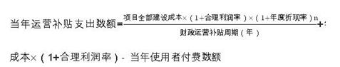 對可行性缺口補助模式的項目,在項目運營補貼期間,政府承擔部分直接付費責任。政府每年直接付費數額包括:社會資本方承擔的年均建設成本(折算成各年度現值)、年度運營成本和合理利潤,再減去每年使用者付費的數額。計算公式為: