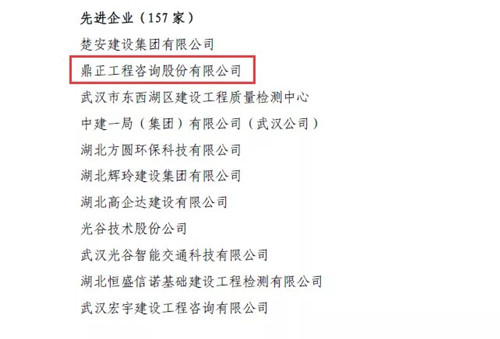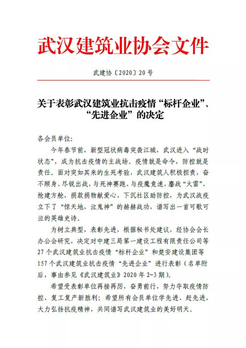 4月14日,武漢建筑業(yè)協(xié)會發(fā)布《武建協(xié)〔2020〕20 號——關(guān)于表彰武漢建筑業(yè)抗擊疫情“標(biāo)桿企業(yè)”、“先進企業(yè)”的決定》,對在抗疫“主戰(zhàn)場”積極擔(dān)責(zé),奮不顧身、盡銳出戰(zhàn),與死神賽跑、與疫魔競速的27家武漢建筑業(yè)“標(biāo)桿企業(yè)”、157家“先進企業(yè)”進行表彰。鼎正咨詢因在武漢抗擊疫情過程中表現(xiàn)突出,獲評“先進企業(yè)”榮譽稱號。